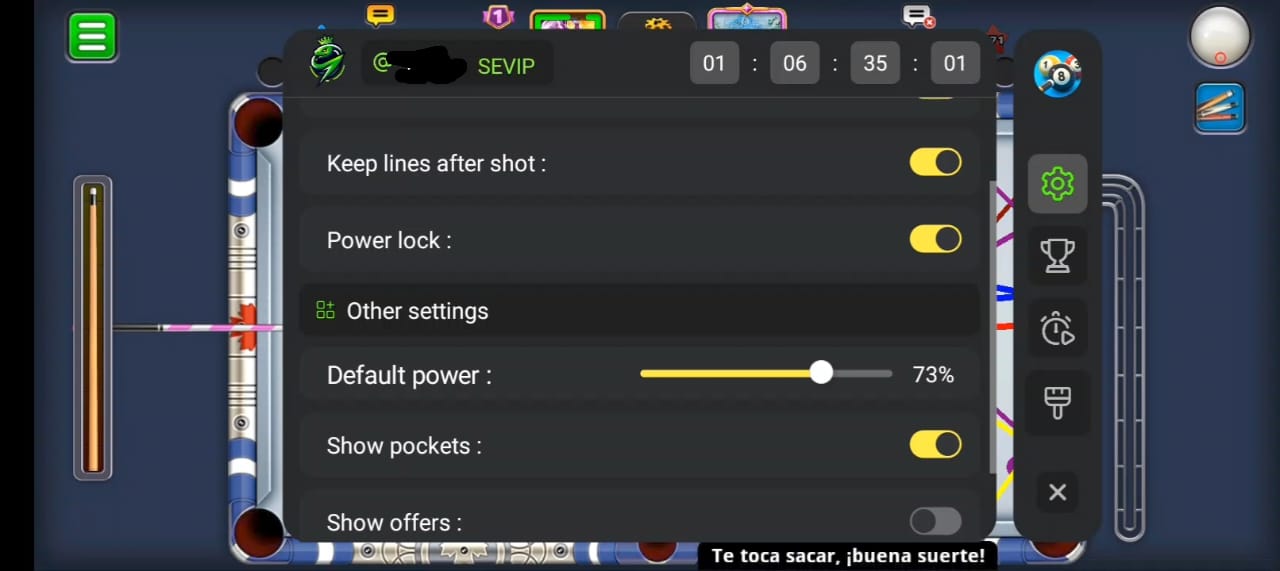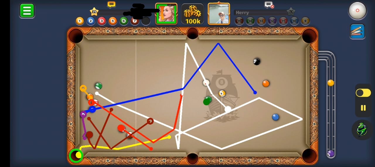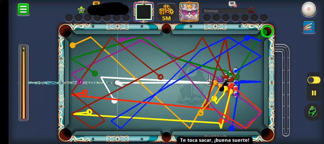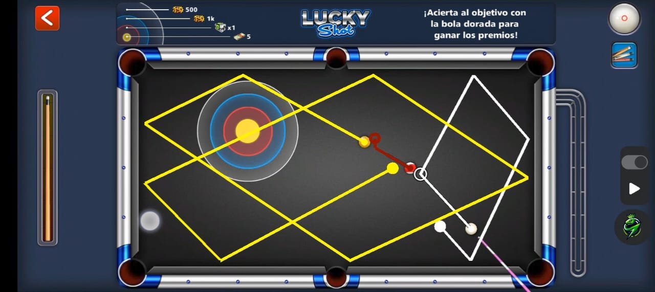 - Predicción de control de giro 100% (con esta opción snake te mostrara la posición exacta de donde quedará la bola blanca con el giro y fuerza que hayas aplicado)